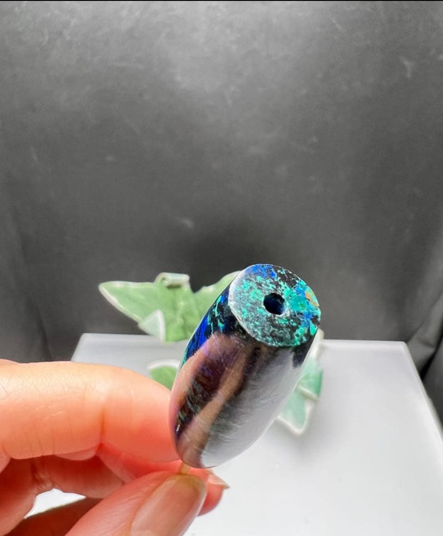 アズマラカイトは、(青)と(緑)が一体となった石で、非常にスピリチュアルな力を持つとされています。天珠型に加工されることで、その力がより集約され、護符的な役割を強めます。
