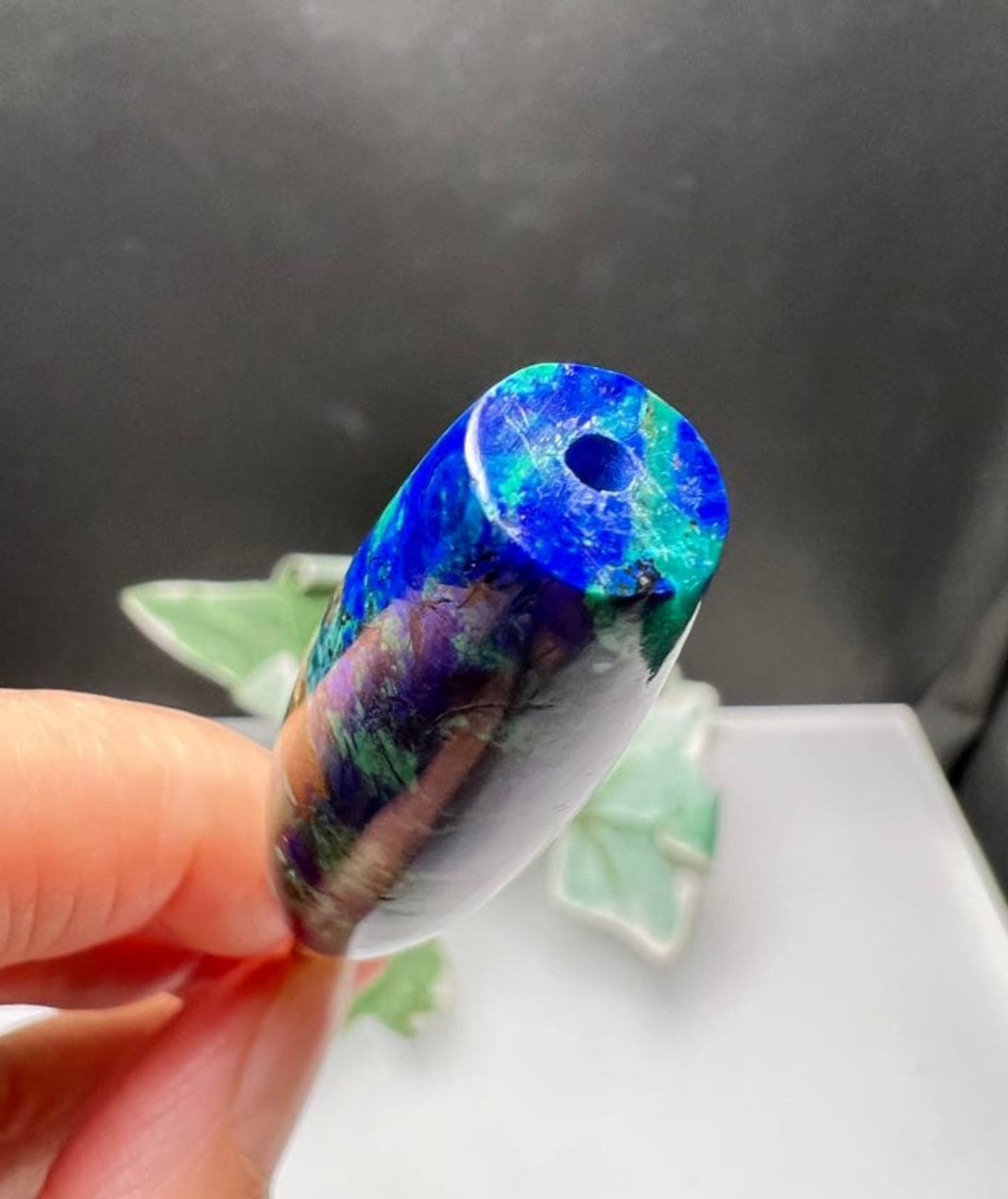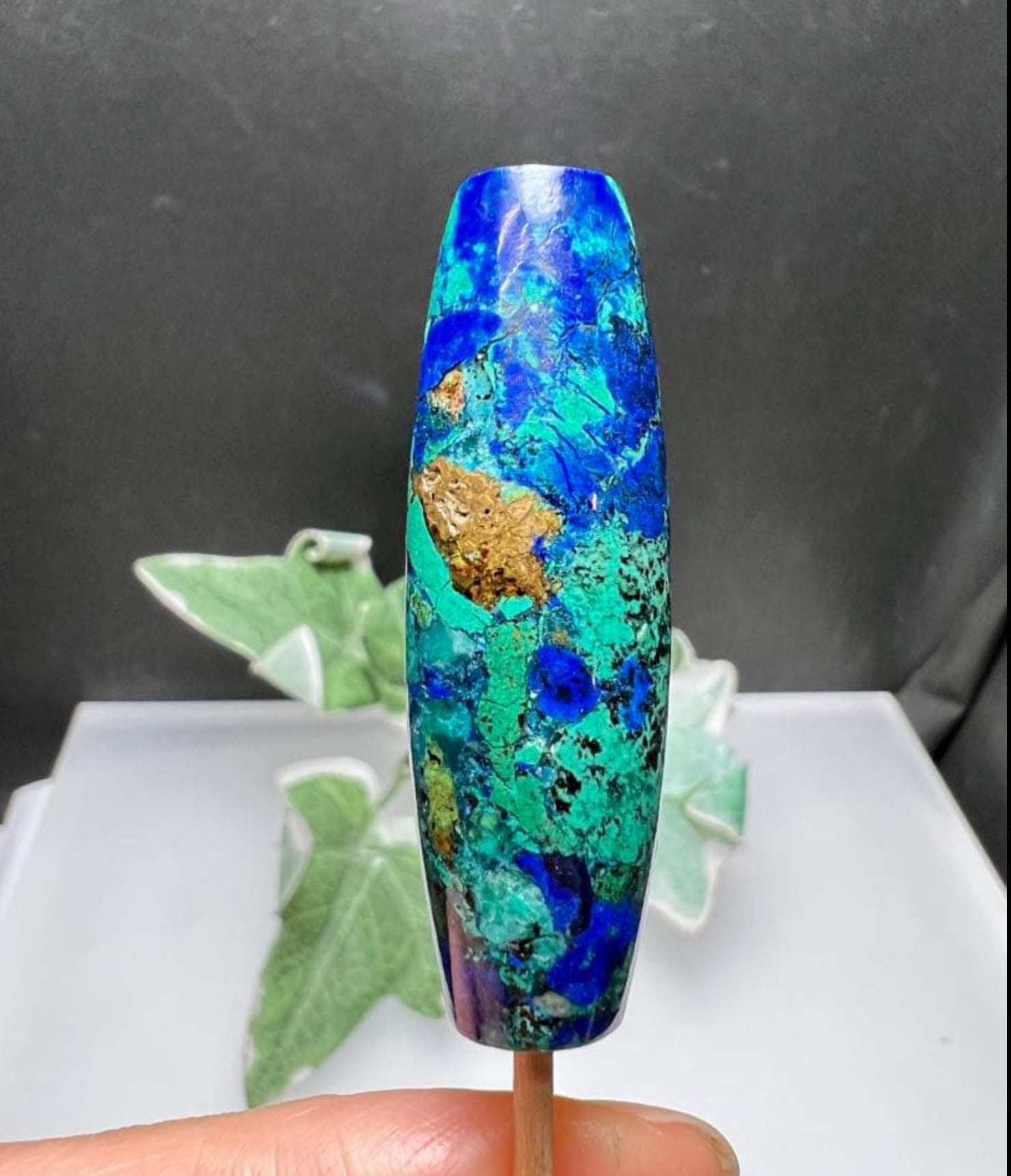 アズマラカイトは、(青)と(緑)が一体となった石で、非常にスピリチュアルな力を持つとされています。天珠型に加工されることで、その力がより集約され、護符的な役割を強めます。
